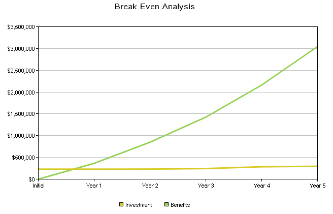 The TCO Analysis page also summarizes your initial investment expenses, your five-year expenses, your total five-year benefits, your total ROI, and estimated payback time in months. The calculator also provides you with a graphical representation of the costs associated with your current solution versus the equivalent IBM PureFlex one. Finally, the report presents you with a graphical Break Even Analysis displaying your costs vs. benefits over a five year period.