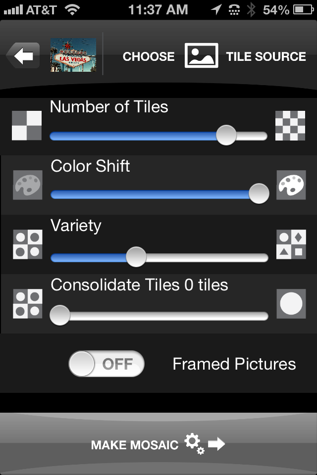 When you create a new mosaic, either you can take a new photo for the main picture or select one from one of your albums. That part is fine. Step two is to adjust the mosaic options such as number of tiles, color shift, variety, tile consolidation, framed pictures and tile source.