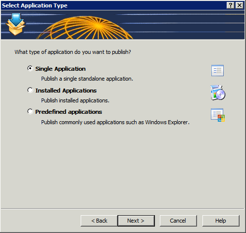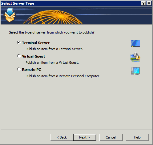 This launches the Publish New Application Wizard and the first screen you see is the Select Server Type screen where you pick the type of server from which you want to publish your application as shown in Figure 2.